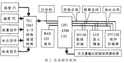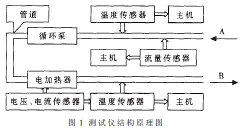 本儀器由流量傳感器、電流傳感器、電壓傳感器、溫度傳感器、泵、電加熱器;管道和主機(jī)等緩?fù)Y(jié)構(gòu)面匡如圖1所示。