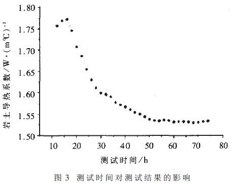 測試時(shí)間對測試結(jié)果的影響如圖3所示。由圖3可以看出,測試時(shí)間不同,計(jì)算出的鉆孔周圍地下巖土的平均導(dǎo)熱系數(shù)也不同。當(dāng)測試時(shí)間達(dá)到約50小時(shí)后,測出的導(dǎo)熱系數(shù)趨于穩(wěn)定,維持在1.530~1.538 W/m℃的范圍之間。通常測試時(shí)間可以選取60小時(shí)左右,這樣既可以保證獲得正確的導(dǎo)熱系數(shù),又可以避免測試時(shí)間過長。