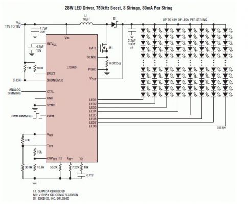 由于大多數(shù)汽車(chē) LCD 背光照明應(yīng)用都需要 20W 至 35W 的 LED 功率,所以 LT3760 設(shè)計(jì)為滿足這些需求。該器件可以將汽車(chē)總線電壓 (6V 至 18V / 標(biāo)稱 12V) 升高至 44V,以驅(qū)動(dòng) 8 個(gè)并聯(lián) LED 串(每串含有 10 個(gè) 80mA 的串聯(lián) LED)。圖 4 顯示了 LT3760 驅(qū)動(dòng) 8 個(gè)并聯(lián) LED 串的原理圖,每串由 10 個(gè) 80mA 的 LED 組成,總功率為 28W。