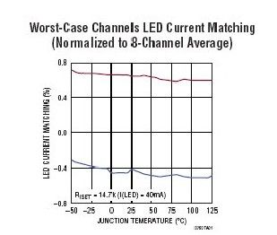 LT3760 采用自適應(yīng)反饋環(huán)路設(shè)計(jì),該設(shè)計(jì)調(diào)節(jié)輸出電壓以使其略高于 LED 串的最高電壓。這最大限度地減小了通過(guò)鎮(zhèn)流電路損失的功率,并幫助優(yōu)化了效率。圖 2 中的電路提供高于 90% 的效率。這很重要,因?yàn)橄巳魏紊嵝枨?,從而?shí)現(xiàn)了占板面積非常緊湊的扁平解決方案。就驅(qū)動(dòng) LED 陣列而言,同樣重要的是,提供準(zhǔn)確的電流匹配,以確保在整個(gè)儀表板上保持背光照明亮度一致。LT3760 在 -40度 至 125度的溫度范圍內(nèi)保證 LED 電流變化不到 ±2%,而且正如在圖 5 中能看到的那樣,它的典型值較接近 ±0.5%。