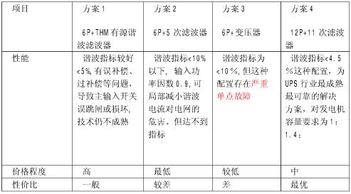 方案2:采用6脈沖UPS+5次諧波濾波器,如果UPS整流裝置為三相全控橋6脈整流器,由整流裝置產生的諧波占所有諧波的近25-33%加5次諧波濾波器后減小到10%以下, 輸入功率因數(shù)0.9,可局部減小諧波電流對電網的危害。這種配置,輸入電流諧波仍然偏大,對發(fā)電機容量配比要求為1:2以上,并存在導致發(fā)電機輸出異常升高的隱患;
