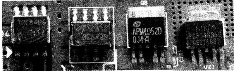 背光燈驅(qū)動(dòng)板主要由振蕩器、調(diào)制器、功率輸出電路及保護(hù)檢測(cè)電路組成,如1圖所示。在實(shí)際電路中,除功率輸出部分和檢測(cè)保護(hù)部分外,振蕩器、調(diào)制器及控制部分通常由一塊單片集成電路完成,這類集成電路常用的主要有BD(Rohm公司生產(chǎn),如BD9884FV、BD9766等)及OZ系列(凹凸微電子公司生產(chǎn),如02960、02964等);功率輸出管多采用互補(bǔ)的功率型場(chǎng)效應(yīng)管,有的采用3腳和8腳(①~③腳為S極,④腳為G極,⑤-⑧腳為D極)貼片封裝型,常見(jiàn)型號(hào)有D454、RSS085、D413、TPC8110、FDD6635.FDD6637等,如圖2所示;還有的采用由N溝道和P溝道組合的5腳或8腳MOSFET功率塊(①腳為Sl極,②腳為Gl極,③腳為S2極,④腳為G2極,⑤~⑧腳為D1、D2極),如SP8M3、TPC8406、4614、APM40520、P2804ND5G等,如圖3所示。保護(hù)檢測(cè)多由集成電路10393、358、393或LM324及其外圍元件來(lái)完成。輸出電路主要由高壓變壓器、諧振電容及背光燈管組成,并設(shè)有輸出電壓、輸出電流取樣電路。
