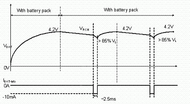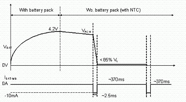 使用者亦有可能在充電或式充電完畢后,在未將電源移除的情況下,即抽離電池的情況。為避免造成危險,IC內部應具有如圖7, 8的電池存在偵測機制。充電IC會以短時間脈沖(每370ms產生2ms的脈沖)方式抽取電池電流,此時若電池存在,則偵測到的電池電壓應大于一預設閥值;若電池已切離,則充電IC偵測到一低電壓,即可判定為電池斷開狀態(tài),并將電池端電壓切斷,保護使用者安全。