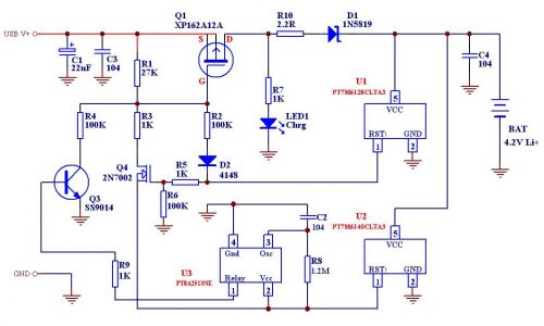 乍看之下,這個方案采用了三個IC,可是U1和U2是采用的SOT-23或者TO-92封裝,就好像普通三極管一樣,其價格也就是2-3個三極管的價格,而U3(PT8A2513NE)也是采用的TO-94封裝,外形和三極管很相似,價錢也相當便宜,不過,這個電路可以實現(xiàn)智能判斷電池是否過放電,決定是否在開始充電時采用小電流預充,另外,采用U3后也將充電后期的補充充電過程延長到大約一個小時!