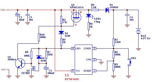 其工作流程大致是:當接上Li+電池和供電電源時,IC通過R1/R2/R3組成的網(wǎng)絡檢測電池電壓,如果電池電壓低于3.3V(由R1-R3的電阻值決定),或者按下按制SW1,此時IC3腳的電壓低于615mV,則IC4腳輸出低電平,通過R5/D2拉低Q1的柵極使之導通,從而通過Q1/R9/D1給電池進行大電流充電,當電池電壓一路上升直至超過4.20V,此時IC的1腳電壓高過615mV,IC內(nèi)部經(jīng)簡單判斷和延時,令4腳輸出高電平,從而關閉大電流充電通道,但是4腳的高電平同時給R7/C2的充電回路供電,令到Q3的柵極電壓慢慢升高,并給R8提供通路導致Q2導通,通過R10給Q1提供一個較弱的導通電流,使之微微導通,從而為電池提供一個較少的補充充電電流。按照圖中所示元件參數(shù)將于大約十分鐘后,由于C2的不斷充電,其端電壓即Q3的柵極電壓不斷上升直至使Q3導通,從而關閉Q2,令到整個充電過程結(jié)束。