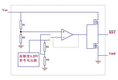 IC內(nèi)含一個高精度的615mV基準電壓源、兩個比較器、一個RS觸發(fā)器和其它一些邏輯電路,其大致功能是:VCC電壓或其它待檢測電壓通過R1-R3組成的分壓網(wǎng)絡接在IC的LTHIN /HTHIN檢測引腳,當待測電壓下降導致LTHIN引腳低于615mV時,輸出腳LBO輸出低電平,而如果待測電壓上升導致HTHIN引腳高于615 mV時,經(jīng)過內(nèi)部邏輯判斷和簡單延時后,輸出腳LBO輸出高電平。