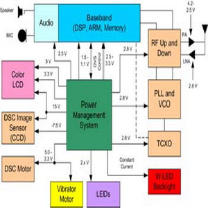 不同的智能型手機(jī)零件有著不同的電源需求,(圖二)是行動電話中需要電源的主要零件簡單方塊圖,例如射頻單元的壓控振蕩器(VCO)以及鎖相回路(PLL)就需要極低噪聲和很高電源拒斥比的電源,確保它們提供最高的傳送和接收效能,因此雖然線性穩(wěn)壓器的效率不高,但由于它沒有輸出漣波,所以是這類電源供應(yīng)的最佳選擇;同樣重要的是將直流轉(zhuǎn)換器的開關(guān)頻率,還有它們的二階和三階諧波,都保持在中頻頻帶之外。由于DSP 和中央處理器的核心電壓已降至1V 左右,以電感為基礎(chǔ)的高效率交換式降壓轉(zhuǎn)換器是理想選擇。至于屏幕背光照明所使用的白光二極管,其電源可來自電荷泵浦或電感式升壓/降壓轉(zhuǎn)換器。