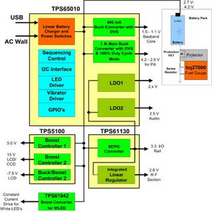 在這個解決方案中,就算鋰離子電池下降至3.3V 左右,在100%負(fù)載周期模式下工作的高效率TPS62200降壓轉(zhuǎn)換器仍能提供3.3V 的I/O電壓。上述所有零件都采用SOT-23 封裝,除了bq24020 電池充電組件、TPS61020 升壓轉(zhuǎn)換器以及TPS61042 白光二極管驅(qū)動組件之外,它們是采用3×3 平方厘米的QFN 封裝。TPS61040 和TPS61042 還內(nèi)建上端FET 晶體管,每顆組件只需要一個外接二極管。bq24020、TPS622xx、TPS61020 和線性穩(wěn)壓器組件全都內(nèi)建FET 晶體管,功率放大器和中央處理器電源采用的動態(tài)電壓調(diào)整技術(shù)可以提高每顆零件的效率,進(jìn)而協(xié)助降低功耗。