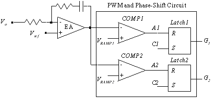 如圖3所示,時(shí)鐘信號C1和C2相差180度,它們分別對應(yīng)的鋸 VRAMP1 和 VRAMP2 也相差180度,電壓誤差放大器的輸出信號 VEA、Vo 分別與 VRAMP1 和 VRAMP2 相比較,再通過兩個(gè)RS觸發(fā)器得到相差180度的驅(qū)動信號 G1 和 G2 。
