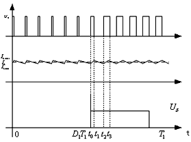 2)f1《f2,即前級(jí)工作頻率遠(yuǎn)低于后級(jí)工作頻率,對(duì)應(yīng)于后級(jí)小脈寬切割。這一情況恰好與前一種情況相反,即前級(jí)變換器在一個(gè)周期內(nèi),后級(jí)變換器已經(jīng)經(jīng)歷了f2/f1個(gè)周期,如圖3所示,在0時(shí)刻,前級(jí)變換器輸出能量,電感儲(chǔ)能,假設(shè)負(fù)載也在此時(shí)同時(shí)放電切割,由于變壓器輸出能量大于負(fù)載吸收能量,故電感電流上升,在t1時(shí)刻開通S,前級(jí)輸出短路,零功率輸出,電感電流繼續(xù)上升儲(chǔ)能,到t2時(shí)刻關(guān)斷S,負(fù)載又開始放電,重復(fù)上述過程,直到tn時(shí)刻,變壓器無輸出,電感開始釋放能量向負(fù)載供電,在前級(jí)變換器開始下一周期之前,負(fù)載吸收的能量全部來自儲(chǔ)能電感。通過分析可以看到,當(dāng)后級(jí)負(fù)載經(jīng)歷f2/f1個(gè)周期時(shí),前級(jí)變換器僅為一個(gè)周期,在這個(gè)過程中,前級(jí)變換器對(duì)負(fù)載的突變是無法調(diào)整的,這種情況下,前級(jí)占空比的大小由負(fù)載的平均功率決定,不受負(fù)載突變的影響,換句話說,只要負(fù)載特性不變,則前級(jí)占空比恒定。為保證前級(jí)有足夠能量供給負(fù)載,必須在一個(gè)周期(T1=1/f1)內(nèi)都能滿足式(3)要求。