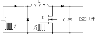 圖1為前、后級(jí)變換器的主電路圖。其中電容C的值很小,它的作用是高壓引弧放電。具體工作過程是這樣的:當(dāng)開關(guān)S關(guān)斷時(shí),由于工件還處于開路狀態(tài),所以電感L中的大電流給C充電,致使工件兩端電壓線性急劇上升,直至高壓擊穿正常放電,此后,電流流經(jīng)工件進(jìn)行加工,一直延續(xù)到S開通時(shí)結(jié)束。假設(shè)前級(jí)變換器的開關(guān)頻率為f1,后級(jí)電子負(fù)載開關(guān)S的開關(guān)頻率為f2,那么f1和f2有以下4種情況。