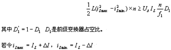 在t0時(shí)刻以前,S管開通,前級(jí)輸出短路,理想情況下,變壓器副邊輸出極窄的方波(Uo),當(dāng)t0時(shí)刻S關(guān)斷時(shí),電流iL經(jīng)S換流至二極管D,給負(fù)載輸出電流。由于t0之前,前級(jí)變換器的占空比極小,突加負(fù)載后,由儲(chǔ)能電感給負(fù)載提供部分電流,隨著時(shí)間的延長(zhǎng),iL減小,受電流環(huán)的控制,前級(jí)變換器占空比增加,使iL回升至原值,故iL有一個(gè)波動(dòng)過程。另外,如果電流環(huán)設(shè)計(jì)沒有達(dá)到最優(yōu)時(shí),那么電流在調(diào)節(jié)過程中的超調(diào)量將很大,調(diào)節(jié)時(shí)間很長(zhǎng),致使加工電流不穩(wěn)定,影響加工效率和精度。但從S的一個(gè)開關(guān)周期看來,由于f1》f2,S的一個(gè)周期中,前級(jí)變換器將要經(jīng)歷多個(gè)周期,即當(dāng)S關(guān)斷時(shí),前級(jí)變換器有足夠多的周期可以調(diào)節(jié)iL,使得iL穩(wěn)定。假設(shè)iL的允許波動(dòng)范圍為ILmin~I(xiàn)Lmax,并假設(shè)f1在S關(guān)斷后經(jīng)過n個(gè)周期,進(jìn)入穩(wěn)定狀態(tài),從能量的角度來看,即要保證在這n個(gè)周期中,當(dāng)前級(jí)變換器無輸出時(shí),電感的儲(chǔ)能要滿足負(fù)載能量需求,這可用式(1)表示。