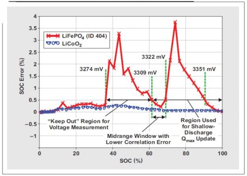如表 1 所示,化學(xué) ID 404 的 OCV 測(cè)量的不合格電壓范圍為 3274mV(最小值,即 ~34% SOC)到 3351mV(最大值,即 ~93% SOC)。大多數(shù)磷酸鐵鋰電池都有非常寬的不合格電壓范圍(參見化學(xué) ID 409 進(jìn)行對(duì)比)。然而,根據(jù)具體的電池特性,為淺放電 Qmax 更新找出一個(gè)更高的最小不合格電壓是可能的?;瘜W(xué) ID 為 404 時(shí),將這一值升高至 3322mV 是可能的,從而允許 3309 到3322 mV 的淺放電 Qmax 更新窗口(請(qǐng)參見圖 2)。設(shè)計(jì)人員可以使用這種中間范圍低誤差窗口,實(shí)現(xiàn)數(shù)據(jù)閃存修改。由于僅能對(duì)高和低不合格電壓范圍進(jìn)行設(shè)定,因此主系統(tǒng)必須保證在 3309mV 以下不會(huì)進(jìn)行更低的 OCV 測(cè)量。(隨著關(guān)聯(lián)誤差的增長,OCV 測(cè)量誤差在 3274 和 3309mV 之間急劇增加。)雖然僅有一個(gè) 13-mV 窗口在更低 OCV 測(cè)量時(shí)起作用(3322 – 3309 mV = 13 mV),但其對(duì)應(yīng)于一個(gè) 70% 到 64% 的 SOC 范圍。