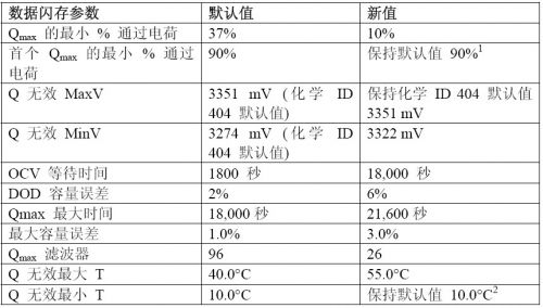 表 2 顯示了電量計(jì)評(píng)估軟件中典型的數(shù)據(jù)閃存參數(shù),必須對(duì)其進(jìn)行修改以實(shí)現(xiàn)淺放電 Qmax 更新。這些特殊參數(shù)均為受保護(hù)(歸為“隱藏”類),但可以由 TI的應(yīng)用人員解鎖。本表格所用舉例電池組為前面所述電池組,其為一種使用A123 1100-mAh 18650 LiFePO4/碳精棒電池(化學(xué) ID 為 404)的 3s1p 電池組。