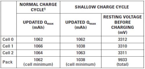 2、 最小通過電荷量必須由電量計(jì)進(jìn)行綜合。默認(rèn)情況下,其為總電池容量的37%。為了進(jìn)行淺放電 Qmax 更新,這一通過電荷百分比可以降低至 10%。這種降低的代價(jià)是 SOC 精確度的損失,但在其它他無法更新 Qmax 的系統(tǒng)中是容許的。