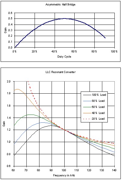 圖2:非對(duì)稱半橋和LLC轉(zhuǎn)換器的增益曲線