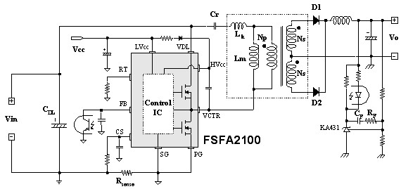 圖3:基于FSFA2100的非對(duì)稱半橋轉(zhuǎn)換器