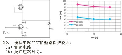 MOSFET的另一個(gè)優(yōu)勢(shì)是其耐用強(qiáng)度。它比IGBT的耐用強(qiáng)度高;與額定功率相同的其它器件相比,具有更寬的安全運(yùn)行區(qū) (SOA)。本文所介紹逆變模塊中的MOSFET在典型的運(yùn)行條件 (Vcc=15V, Vdc="300V", Tc="25"℃) 下,都能承受80ms的短路電流 (見圖2)。而且,在出現(xiàn)電涌時(shí),基于MOSFET逆變器的抵御能力優(yōu)于額定電壓相同的IGBT方案,這已被開關(guān)器件的雪崩額定電壓值所證實(shí)。因此,在220V下可采用額定電壓為500V的MOSFET,而在相同條件下采用IGBT,其額定電壓則需要達(dá)到600V。但是,傳統(tǒng)的MOSFET開關(guān)速度極高。MOSFET通常用于快速開關(guān)轉(zhuǎn)換器,如AC/DC或DC/DC電源,這些應(yīng)用場(chǎng)合要求柵極電荷Qg盡可能少,以降低開關(guān)損耗。不過(guò),在電機(jī)驅(qū)動(dòng)應(yīng)用中,這種快速特性沒有用處,尤其是高的dV/dt值還會(huì)引起電磁干擾。穩(wěn)定性與最佳性能不易兼顧.