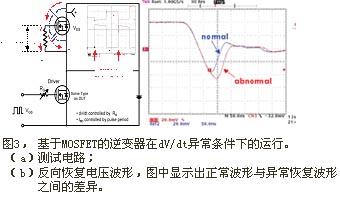 通常,增加?xùn)艠O阻抗會(huì)降低MOSFET的開關(guān)速度。在如圖3(a)所示的半橋電路中,如果高壓側(cè)MOSFET的柵極阻抗 (在HVIC中實(shí)現(xiàn)) 大,將會(huì)存在一定的短路電流;這個(gè)電流是上面那個(gè)MOSFET導(dǎo)通時(shí)的密勒電容Cgd感應(yīng)產(chǎn)生的,不嚴(yán)重時(shí)一般不會(huì)察覺。但是,正如圖3(b)所示,這種異常行為會(huì)增加逆變開關(guān)的損耗 (導(dǎo)通損耗),并最終減弱系統(tǒng)的額定功率和穩(wěn)定性。在這樣的瞬態(tài)過(guò)程中,要降低開關(guān)速度,同時(shí)又不失穩(wěn)定性,上方那個(gè)MOSFET的Vgs應(yīng)小于閾值電壓Vth。換句話說(shuō),最好通過(guò)調(diào)節(jié)HVIC的關(guān)斷阻抗來(lái)保證系統(tǒng)的穩(wěn)定性,防止因電壓變化而感應(yīng)短路電流。但這會(huì)增加MOSFET的關(guān)斷dV/dt值。