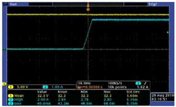 圖4 示波器屏幕顯示了當(dāng)負載電流從0A變至2.8A時,吉時利2200-32-3的輸出電壓調(diào)節(jié)。在整個變化過程中,輸出電壓保持穩(wěn)定