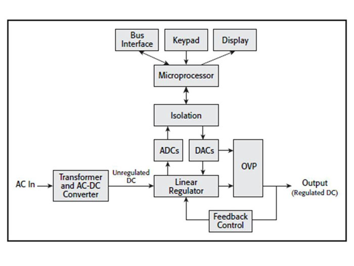 歷史上,直流電源用戶使用電位計設(shè)置輸出電壓或電流。今天,微處理器從用戶接口或遠端接口接收輸入。數(shù)模轉(zhuǎn)換器(DAC)接收數(shù)字設(shè)置,將其轉(zhuǎn)換為模擬值并用作模擬調(diào)節(jié)器的參考。設(shè)置分辨率和準(zhǔn)確度的值由轉(zhuǎn)換質(zhì)量和調(diào)節(jié)過程決定。
