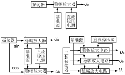 根據(jù)輸出交流電源的相數(shù),穩(wěn)頻電源可分為單相式,兩相正交式和三相對(duì)稱式。單一輸出量的穩(wěn)頻穩(wěn)壓源由于各相間的相移恒定,因此不需要移相調(diào)節(jié)電路。當(dāng)輸出物理量既要求有電壓回路,還要求有電流回路,且電壓與電流的相位差要求既能調(diào)節(jié)又能穩(wěn)定以適應(yīng)不同負(fù)載時(shí),則相應(yīng)的穩(wěn)頻穩(wěn)壓/穩(wěn)流電源應(yīng)包括電壓和電流輸出回路。其結(jié)構(gòu)如圖1所示。