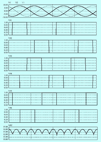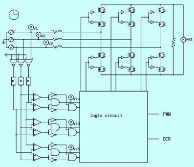 虛擬整流技術(shù)的實(shí)現(xiàn),主要通過三相同步檢測電路取得同步控制信號,然后控制功率器件來模擬二極管橋式整流電路對三相交流電進(jìn)行整流,同時(shí)防止輸入的三相交流電相間短路。其原理如圖9所示,是一個(gè)輸出方向固定的虛擬整流電路。仿真波形如圖5所示,它們分別是矩陣變換單元的三相輸入電壓、6路同步信號和虛擬整流后得到的輸出電壓波形。