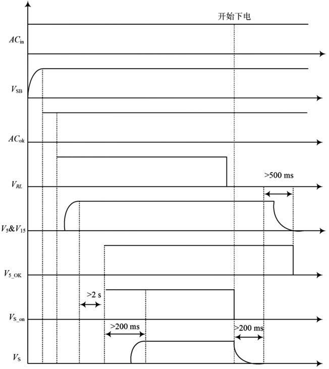 PDP電源在工作時,具有嚴(yán)格的開機(jī)時序和關(guān)機(jī)時序。當(dāng)插上整機(jī)電源插頭后,輸出待機(jī)電源VSB,同時交流信號檢測ACOK=1.此時按下開關(guān)。數(shù)字電路CPU向電源發(fā)出電源控制信號,使VRL =1,電源向各種邏輯電路、控制電路、保護(hù)電路提供+5V,+15V電源,然后將V5_ok置1.當(dāng)電源檢測信號V5_ok=1時,數(shù)字電路CPU向電源發(fā)出VS_on=1.PDP電源向顯示系統(tǒng)提供180V高壓。關(guān)機(jī)時,先關(guān)掉高壓電源,然后再關(guān)掉+5 V,+15 V 電壓。工作時序如圖2所示。