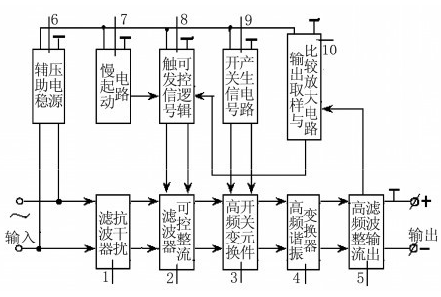 如圖1所示,它由抗干擾濾波器1、可控整流濾波器2、高頻變換開(kāi)關(guān)元件3、高頻諧振變換器4、高頻整流濾波輸出5依次連接而成??煽卣鳛V波器2的導(dǎo)通角的控制由觸發(fā)信號(hào)控制邏輯8完成。慢起動(dòng)電路7使觸發(fā)信號(hào)控制邏輯8在開(kāi)機(jī)時(shí)的導(dǎo)通角由零度逐步上升。輸出取樣與比較放大電路10,將高頻整流濾波輸出5的輸出電壓與基準(zhǔn)電壓源相比較且進(jìn)行放大,從而控制觸發(fā)信號(hào)控制邏輯8,使輸出電壓穩(wěn)定。改變基準(zhǔn)電壓源的大小,就能改變觸發(fā)信號(hào)控制邏輯8的觸發(fā)導(dǎo)通角,從而調(diào)節(jié)輸出電壓的大小。開(kāi)關(guān)信號(hào)產(chǎn)生電路9產(chǎn)生一個(gè)適合高頻諧振變換器4的方波信號(hào),用來(lái)控制高頻變換開(kāi)關(guān)元件3的導(dǎo)通和截止,使直流電能進(jìn)入高頻諧振變換器4,形成高頻電流震蕩;并經(jīng)高頻變壓器輸出至高頻整流濾波輸出5,減小了開(kāi)關(guān)噪聲。輔助穩(wěn)壓電源6給慢起動(dòng)電路7、觸發(fā)信號(hào)控制邏輯8、開(kāi)關(guān)信號(hào)產(chǎn)生電路9、輸出取樣與比較放大電路10提供能量和基準(zhǔn)電。