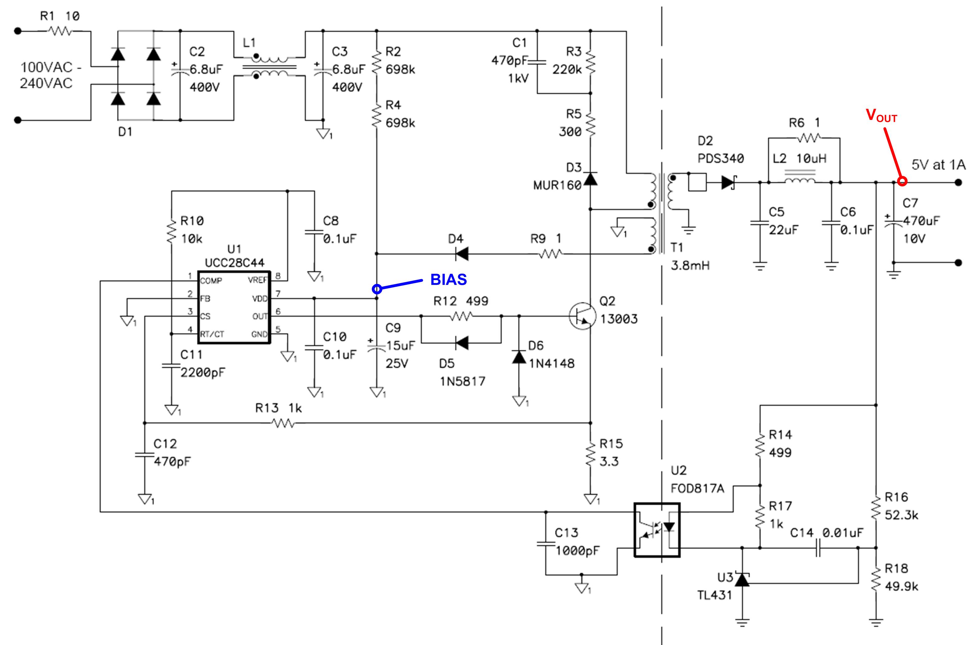 圖2顯示了移動(dòng)設(shè)備充電器所使用的一個(gè)5V/5W非連續(xù)反向電源的原理圖。在范例中,我們使用了UCC28C44控制器,它是大多數(shù)經(jīng)濟(jì)型峰值電流模式控制器的代表,擁有功率限制功能。在非連續(xù)反向結(jié)構(gòu)中,如果忽略效率影響,可使用方程式1計(jì)算負(fù)載功率(P)的大小。
