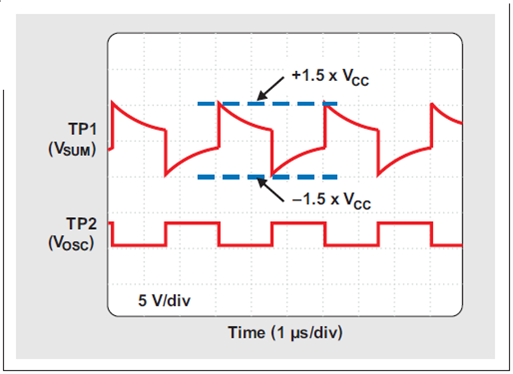 著名的三反相門振蕩器由 U1a、U2a 和 U2b 組成,選擇它是因?yàn)樗诠╇姴▌臃矫孑^為穩(wěn)定。通過一個 100-pF 陶瓷電容器(COSC)和兩個 10-kΩ 電阻器(ROSC1 和 ROSC2),它的正常頻率被設(shè)定為 330kHz。在 3.0-V 到 3.6-V 電源電壓波動范圍內(nèi),振蕩器擁有接近 50% 的占空比,以及低于 ±1.5% 的最大頻率波動。圖 2 顯示了 ROSC1 和 ROSC2 (TP1) 相加點(diǎn)和振蕩器輸出 (TP2) 處的波形。所有電壓均為參考電路基準(zhǔn)電壓測得。[page]