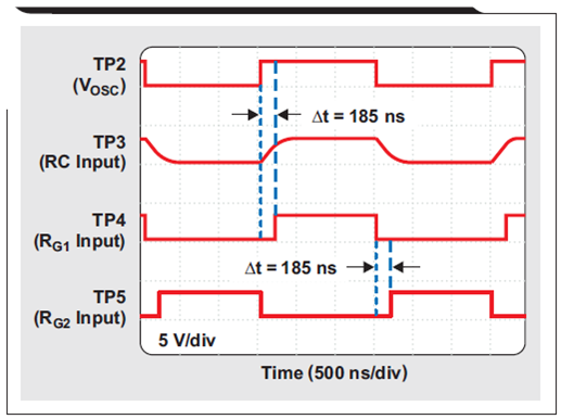 施密特觸發(fā)電路 NAND 柵極(U1c、U1d)實(shí)現(xiàn)先斷后通功能,以避免 MOSFET 導(dǎo)通階段交疊。其他兩個NAND門(U2c,U2d)配置為反相緩沖器,從而產(chǎn)生驅(qū)動 N 通道 MOSFET(Q1、Q2)必需的正確信號極性。圖 3 顯示了完整的先斷后通動作。為了適應(yīng)標(biāo)準(zhǔn)邏輯門的有限驅(qū)動能力,我們選擇了 MOSFET,因?yàn)槠漭^低的總電荷和較短的響應(yīng)時(shí)間。