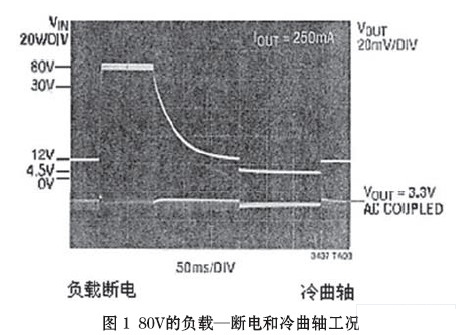 “冷曲軸”(cold crank)段,發(fā)生在汽車發(fā)動機經受冷卻或凝固期間,發(fā)動機油變的非常粘滯。因而要求起動機輸出更大的轉矩,相繼需要蓄電池提供更大的電流。這一大的電流負載導致蓄電池/一次母線的電壓降低,甚至低于4V的點火電壓。隨后,又回復至額定電壓13.8V(圖1)。這在某些應用場合,例如發(fā)動電機控制、安全系統(tǒng)和導航系統(tǒng)均不可避免。故要求具有良好調節(jié)的輸出電壓(一般為3.3V)貫穿“冷曲軸”段,以實現全過程的無間斷(連續(xù))運行。