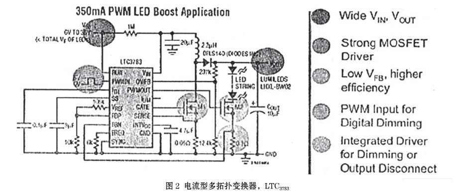 LTC3783是帶恒流PWM調光的電流型多拓撲變換器(圖2),用于驅動大功率LED燈串。本項專利技術可提供非??於鴾蚀_的負載切換,不會產生瞬時的欠電壓或過電壓,能數字式達到3000∶1的調光率(100Hz),純色的PWM調光可確保白色LED和紅綠藍(RGB) LED的顏色完整性。LTC3783利用模擬控制,容許附加100∶1的調光比,因人眼對周圍光線的變化很敏感,故這一比率必不可少。該多功能的控制器可用于升壓、降壓、升降壓雙向變換器或反激式(Flyback)變換器,或作為恒流/恒壓的調節(jié)器。利用MOSFET的通態(tài)電阻(on-resistance)可取消傳感電流的電阻器,并提高了效率。LTC3783芯片的應用還包括:高電壓LED陣列和LED背光,以及在電訊、自動化與工業(yè)控制系統(tǒng)中的調節(jié)器。