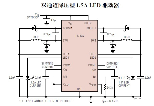 LTC3475以其寬的輸入電壓范圍(4V~36V,max40V),可調節(jié)含汽車動力系統(tǒng)在內的廣闊的電源陣列。它的開關頻率調節(jié)幅度為200kHz~2MHz,能利用很小的電感器和陶瓷電容器,與耐熱的TSSOP-16組件結合,在驅動2個或4個大電流LED時,可提供結構非常緊湊的解決方案。