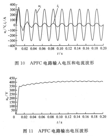 單相APFC電路采用Matlab7.6進(jìn)行建模與仿真。圖10為APFC電路輸入電壓和電流波形,可見網(wǎng)側(cè)輸入電流由窄脈沖波形變成正弦電流波形,且與輸入電壓同相位。圖11為APFC電路輸出電壓波形,可見經(jīng)過60ms的軟啟動(dòng)過程之后,輸出電壓穩(wěn)定在400V左右,滿足設(shè)計(jì)要求。圖12為APFC電路輸入電流諧波分析結(jié)果,可見除基波外,其余諧波含量均很小?! ?/p>