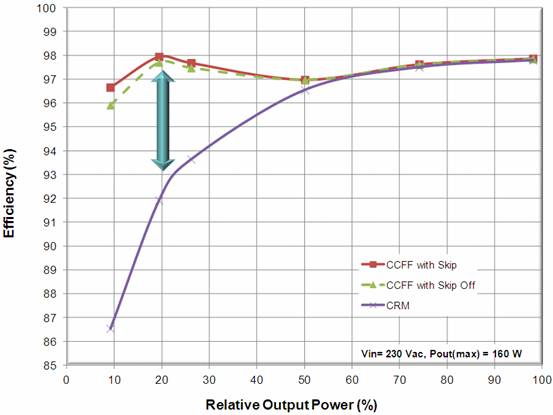 采用CCFF控制架構(gòu),最大的好處莫過(guò)于提升能效。采用傳統(tǒng)CrM(臨界導(dǎo)電模式)/BCM(邊界線導(dǎo)電模式),在負(fù)載降低時(shí),開(kāi)關(guān)頻率上升;負(fù)載極低時(shí),控制器可能進(jìn)入“跳周期模式”,滋生可聽(tīng)噪聲。而采用CCFF控制架構(gòu),可以在負(fù)載降低時(shí)降低開(kāi)關(guān)頻率,減小功率損耗;在輕載時(shí),控制器可以鉗位高于可聽(tīng)噪聲頻段的較低頻率;負(fù)載極低時(shí),則采用跳周期模式工作(可以輕易關(guān)閉)。因此,這種谷底導(dǎo)通可進(jìn)一步提升能效,減小電磁干擾。圖4比較了基于NCP1611CCFF PFC及傳統(tǒng)CrM PFC在不同負(fù)載條件下的能效。由圖中可見(jiàn),在10%輕載條件下,基于帶跳周期模式的NCP1611的演示板的能效高達(dá)近97%(關(guān)閉跳周期模式下也達(dá)近96%),而基于傳統(tǒng)CrM架構(gòu)的演示板能效僅為近87%,相關(guān)近10%。可見(jiàn)NCP1611在提升電源輕載能效方面表現(xiàn)尤為優(yōu)異。