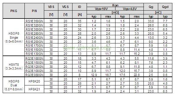 根據(jù)不同用途,提供3種小型封裝。HSMT8比HSOP8的安裝面積減少了65%,為節(jié)省空間做出巨大貢獻(xiàn)。而且,產(chǎn)品陣容中還包括DC/DC電源電路中的高邊(High Side)用MOSFET與低邊(Low Side)用MOSFET復(fù)合化的新封裝HSOP8(Dual)。不僅安裝面積減小,而且還可有助于減少安裝次數(shù)。