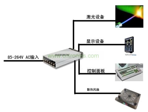 一臺癌癥治療設備主系統(tǒng)需要155V的內部電壓供應,且需得到醫(yī)療認證,18V的顯示器,48V的馬達及12V+5V的控制面板。該設備由于電壓需求特殊,曾經采用的電源系統(tǒng)需要專門開發(fā),相當復雜而且價格高昂,所以選擇Excelsys的兩個不同型號的機殼配合使用。先選擇一臺符合醫(yī)療設備安規(guī)標準的 XMC5550的電源將三個Xg5模塊串聯(lián)輸出一個155V的電壓為設備主系統(tǒng)供電,其次選擇一臺普通工業(yè)電源XLC5780用于顯示器、馬達及控制面板供電。如此復雜的系統(tǒng)這樣就搞定了,成本遠低于以前的設計方案。