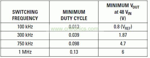 最小可控“導通”時間限制是DC/DC轉換器IC的一個特點,其為脈寬調制(PWM)電路的最窄可達脈寬。在降壓轉換器中,開關周期期間功率MOSFET導通的時間百分比被稱作占空比,其等于輸出電壓與輸入電壓的比。使用TPS54160轉換器時,占空比為0.104(4 V/48 V),而數(shù)據(jù)表中列出的最小“導通”時間為130 ns??煽孛}寬限制產(chǎn)生一個最小可達占空比,而用最小“導通”時間乘以開關頻率,我們可以輕松地計算出該占空比的大小。一旦知道了最小占空比,利用VIN乘以最小占空比,我們便可以計算出最低可達輸出電壓。最低輸出電壓同樣也受轉換器基準電壓的限制,使用TPS54160時其為0.8V。