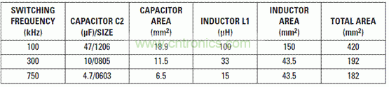 表4列出了三種設計要求的總電路板面積,以及電容和電感的焊盤面積。電容或者電感的建議焊盤面積,稍稍大于單個組件本身,且三種設計舉例均使用了該面積。每個組件占用的面積相加(其包括IC、濾波器以及所有其它小型電阻器和電容的焊盤尺寸),然后將得到的結果乘以2倍(考慮到組件的間距),便得到總面積。100-kHz和750-kHz設計之間存在近250 mm2的總面積節(jié)省,從而使濾波器體積縮小50%,而板空間占用減少55%。但是,存在收益遞減規(guī)律,因為電容和電感值無法減少至零!換句話說,不斷推高頻率并不能夠一直減小總尺寸,因為你無法總是能夠在市場上買到這些尺寸適合且批量生產(chǎn)的電感和電容。注意,33-µH和15-µH電感占用相同的面積。存在這種可能性,是因為33-µH電感的高度為3.5 mm,而15-µH電感僅高2.4 mm。我們想通過這兩種電感來說明的觀點是:電感與體積成正比例關系。