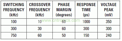 瞬態(tài)響應是電源性能級別的一個較好指標。我們利用每種電源的波特圖來表明高開關頻率的對比情況(參見圖3)。如圖所示,每個電源的相位裕度在45°和55°之間,其表明瞬態(tài)響應得到較好的抑制。交叉頻率約為開關頻率的1/8。使用快速開關DC/DC轉換器時,設計人員應確保電源IC誤差放大器具有足夠的帶寬來支持高交叉頻率。TPS54160誤差放大器的單位增益頻寬一般為2.7 MHz。表5顯示了實際瞬態(tài)響應時間以及電壓峰值過沖的相關值。開關頻率越高,過沖值便越是更低,原因是更寬的帶寬。