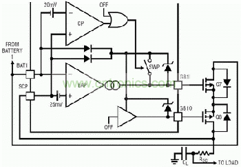 每條電源通路都由兩個背對背的PFET組成,這兩個PFET與短路檢測電阻RSC串聯(lián)。電池電源通路(PowerPathTM)開關驅(qū)動器等效電路如圖 5 所示。