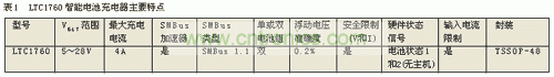 LTC1760是一個高度集成的三級電池充電器和選擇器,用于使用雙智能電池的產(chǎn)品。它是一個降壓開關拓撲電池充電器,具有符合智能電池標準定義的多種功能和其他新增功能,如輸入限流和安全限制,等等。三個SMBus接口使LTC1760能實現(xiàn)諸如跟蹤兩個電池的內(nèi)部電壓和電流之類的伺服功能,并允許一個SMBus主機監(jiān)視任一電池的狀態(tài)。這種伺服技術能使充電器的準確度同電池內(nèi)部電壓和電流測量值只有±0.2%的誤差。