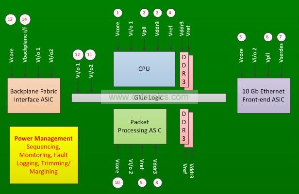 在圖1所示的線卡中,有四個主要的集成電路和一些粘合邏輯。每個集成電路都需要多個電源,并有定序的要求。這塊電路板有14個電源電壓,需要進行監(jiān)測、定序、微調和裕度調整。此外,電路板的設計還需要將任何意想不到的電源故障記錄在非易失性存儲器中。