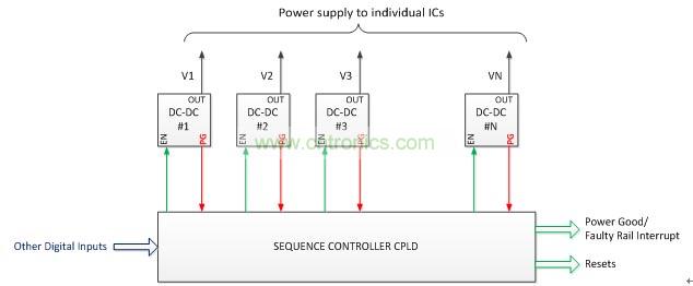 一個實現(xiàn)復雜的電源管理的常用方法(圖2)是使用DC-DC轉換器的電源良好信號,以監(jiān)測這個電源,并使用CPLD來實現(xiàn)定序算法(控制DC-DC轉換器的使能信號)。CPLD也產生監(jiān)測信號,如電源就緒/故障電壓中斷和復位信號。