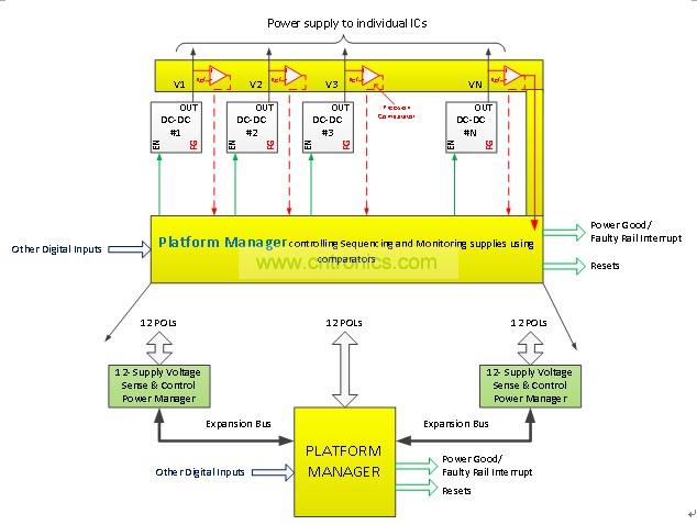 圖3展示了遠程傳感和實施集中控制。這種架構類似圖2所示的電路方案。由于比較器和ADC的整合,這種方案需要的元件數量最少。此解決方案使用了一片萊迪思的Platform Manager和兩片萊迪思的Power Manager集成電路,實現(xiàn)了多達36個電壓的電源管理。