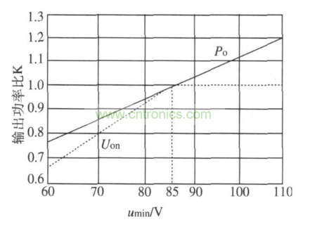 PD ,η, Po 關(guān)系曲線均對(duì)交流輸入電壓的最小值進(jìn)行了限制,umin = 85 V.如果交流輸入電壓最小值不符合上述的要求,就會(huì)直接影響芯片的正確選擇。此時(shí)必須從實(shí)際的交流輸入電壓u? min最小值對(duì)應(yīng)的功率P''o 折算成umin為規(guī)定值時(shí)的等效功率Po,才能使用上面的圖。功率修正的方法如下: 選擇使用的特性曲線,然后根據(jù)已知的u''min值查出折算系數(shù)K;將P ''o折算成umin為規(guī)定值時(shí)的等效功率Po,表達(dá)公式P o=P''o / K;然后從圖3、圖4 中選用適當(dāng)?shù)年P(guān)系曲線。