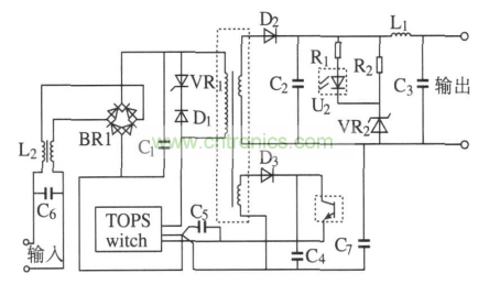 圖6給出了由TOPSwitch 構(gòu)成的反激式電源的原理圖。其工作過(guò)程如下: 輸入交流電經(jīng)整流橋BR1 整流后再經(jīng)電容C1 濾波,變?yōu)槊}動(dòng)的直流電。