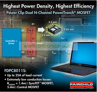 張瑞斌向記者介紹:“FDPC8011S專為更高的開關頻率的應用而開發(fā),在一個采用全Clip封裝內(nèi)集成1.4m? SyncFETTM 技術(shù)和一個5.4m?控制MOSFET、低質(zhì)量因子的N溝道MOSFET,有助于減少同步降壓應用中的電容數(shù)量并減小電感尺寸。該器件具有源極朝下和低側(cè)MOSFET可以實現(xiàn)簡單的布局和布線,提供更緊湊的線路板布局并獲得最佳的散熱性能。”FDPC8011S具有超過25A的輸出電流,與其它普通3x3mm2 雙MOSFET器件相比,輸出電流容量提高了2倍。